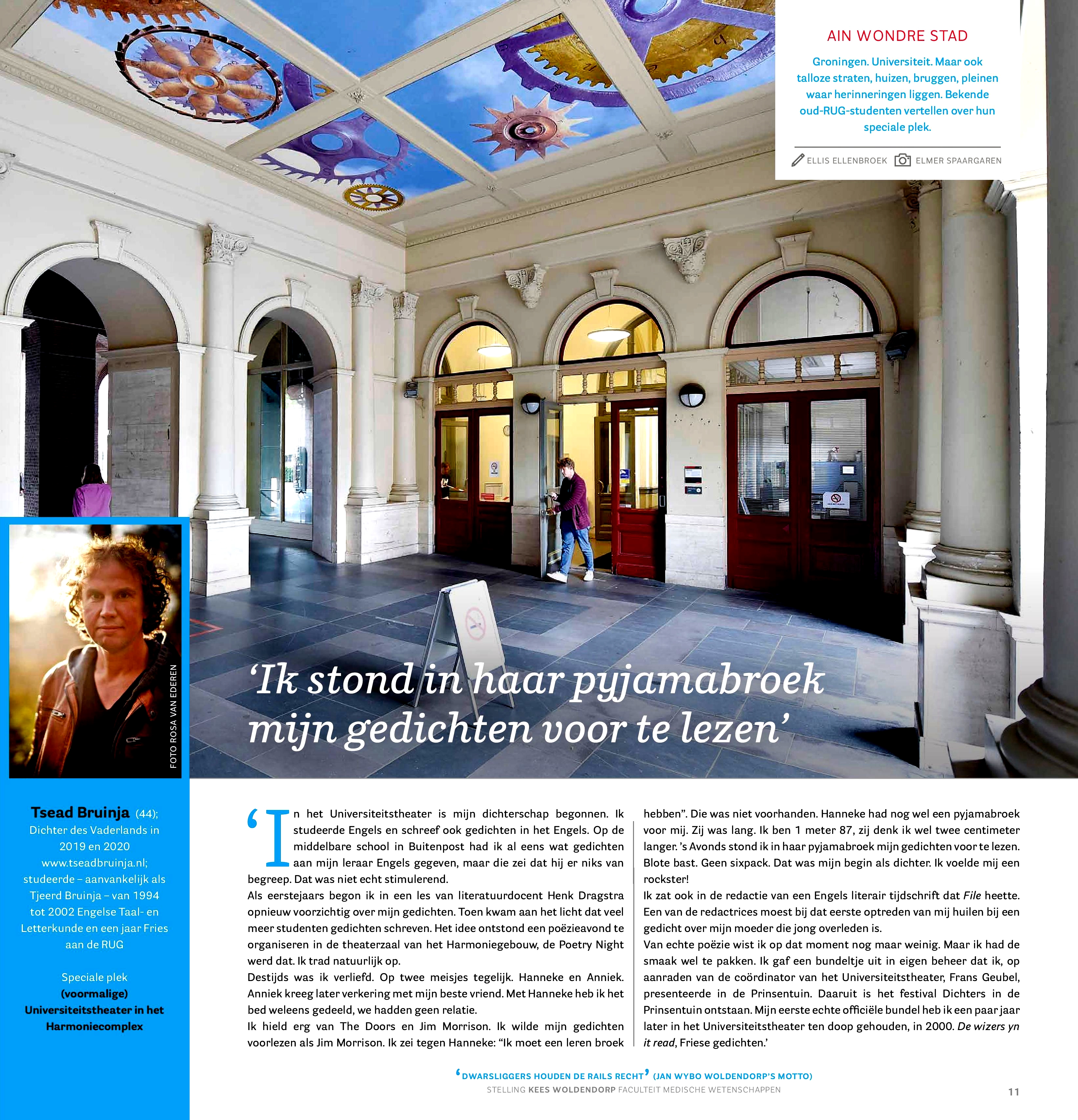 "Mijn broer is zijn zaad kwijt omdat drugs / de maag voedde van zijn stervende zus. // Ik ben gestopt met het zweverige werk. / Ooit had ik op een postkantoor gewerkt.// Ik kon niets zien door die ouderwetse bril." (Michael Tedja)