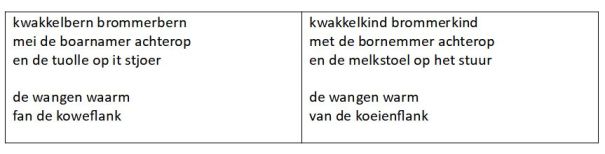 In de derde afdeling, een mooie reeks met de titel ‘Een lieve vrouw was je moeder en een botte borstrok’, ontbreken de hoofdletters en interpunctie echter niet; de zinnen zijn volledig en de gedichten zeer toegankelijk. Dat heeft een duidelijke functie. Het zijn ‘portretgedichten’, die ontstonden na gesprekken met ouderen in Friese zorginstellingen. Bruinja bezocht hen met de muzikant Zea, fotografe Rosa van Ederen en een steeds wisselende gastdichter. De gedichten werden tijdens feestelijke bijeenkomsten gepresenteerd. Opvallend is het gebruik van een verleden tijd die fictie aan lijkt te kondigen: ‘En toen was ik Grytsje en kende ik Teatske sinds de schoolbanken / al vijfentachtig jaar’. Of: ‘Ik was mevrouw Knol’. Vergelijk het met de fantasierijke spelletjes van kinderen: ‘Dan was jij de vader, en ik was de moeder’. Als je bedenkt dat Bruinja van orale vertellingen gedichten maakte, die hun eigen vorm en werking hebben, is dit niet zo vreemd. Het zijn bovendien bewerkingen van de oorspronkelijke portretgedichten. Een van de mooiste is ‘Smirge bonken’.